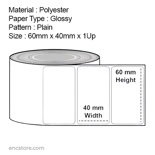 Plain White Polyester barcode label, 60mm x 40mm x 1Up, High quality printing, 1 inch core, suitable for barcode printing, 500 labels per Roll